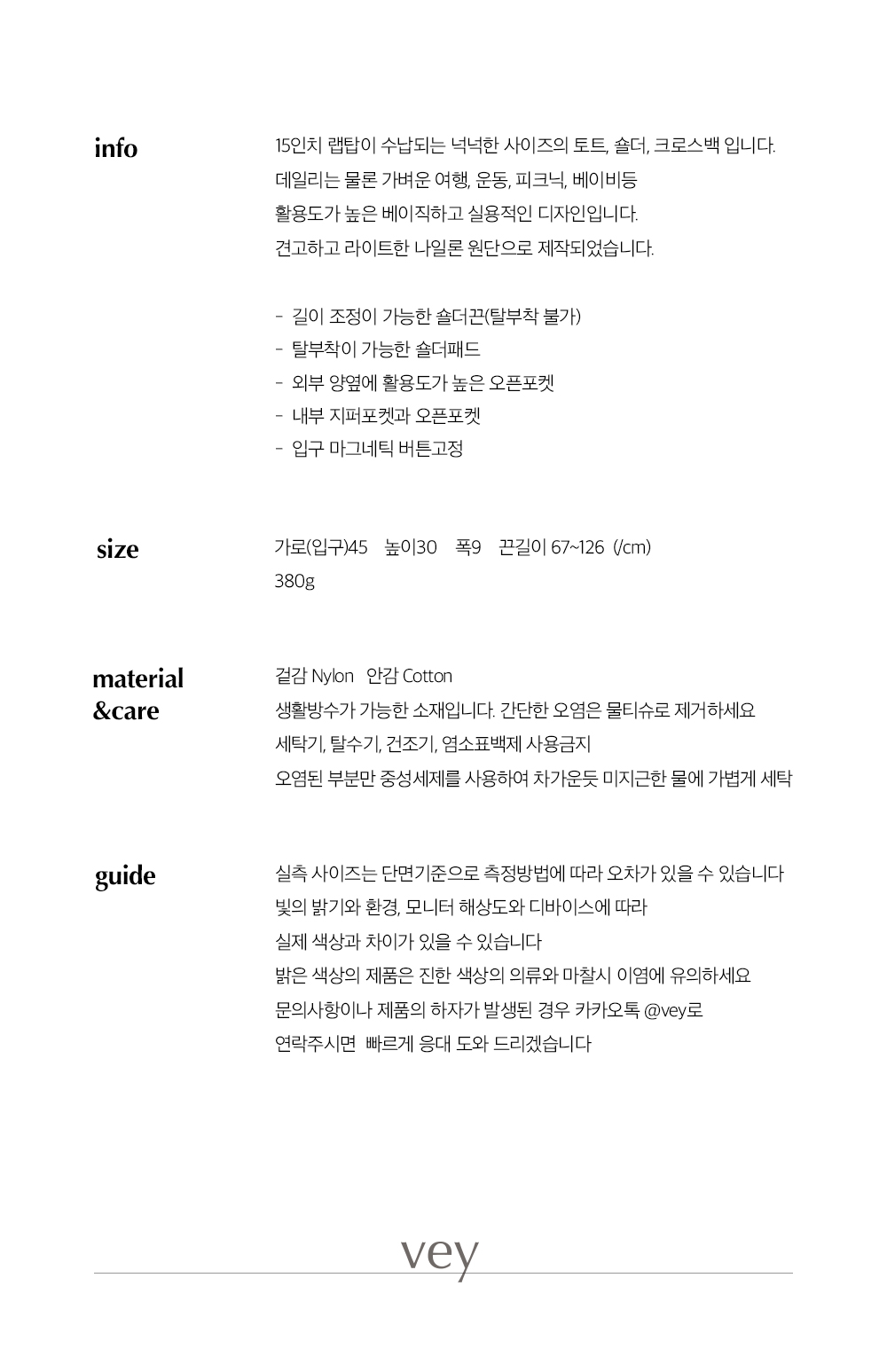 15인치 랩탑이 수납되는 넉넉한 사이즈의 토트, 숄더, 크로스백 입니다.