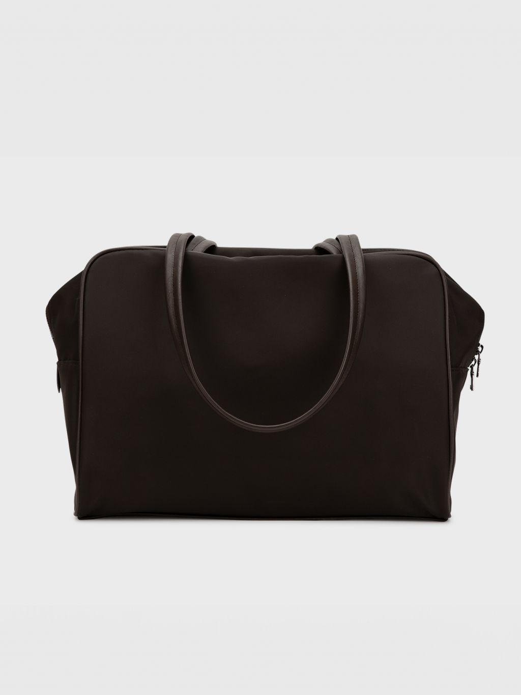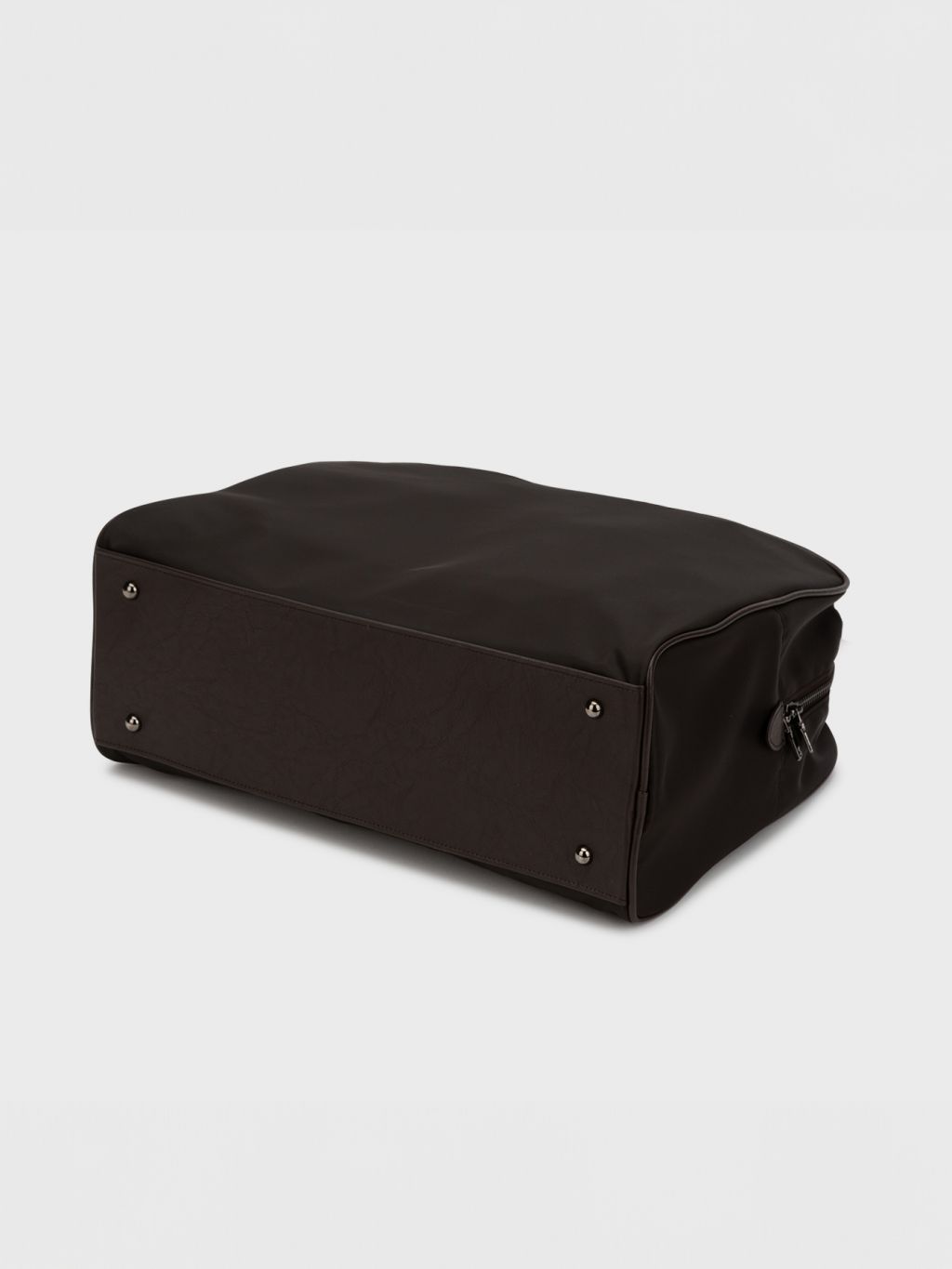 폭닥하게 합포가공한 은은한 광택의 나일론과 비건레더를 함께 사용하여