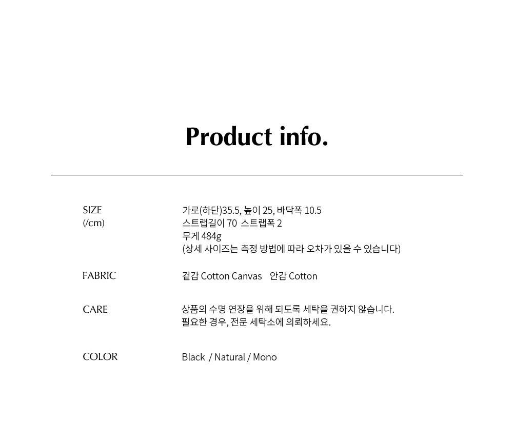 Material 겉감 : 코튼캔버스, 인조가죽 / 안감: 코튼